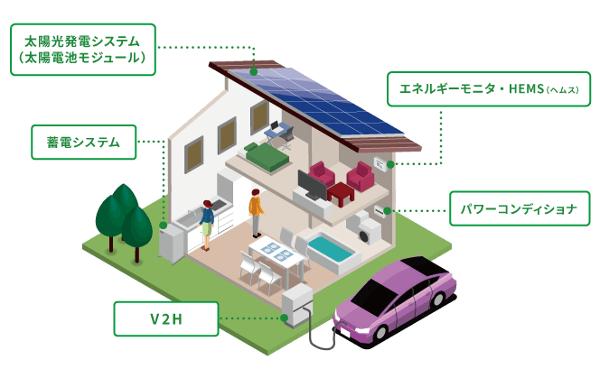 発電量や消費電力を「見える化」、効率的な節電をサポート。さらに、HEMS(ホームエネルギーマネジメントシステム)を導入することで、太陽光発電システムや蓄電システム、V2Hと連携して、未来のエコな暮らしをサポート。